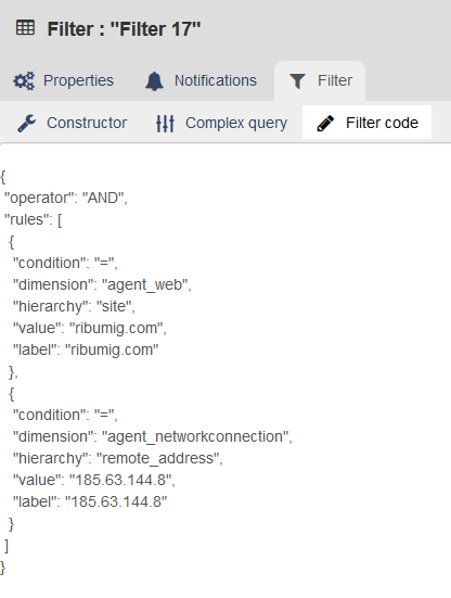 4. Filter code - represents a text editor displaying the filter parameters in the text form consisting of a tag (for example: agent_application@app_name:app_name), assignment operator „=“ and values of filter parameters (e.g. chrome.exe).