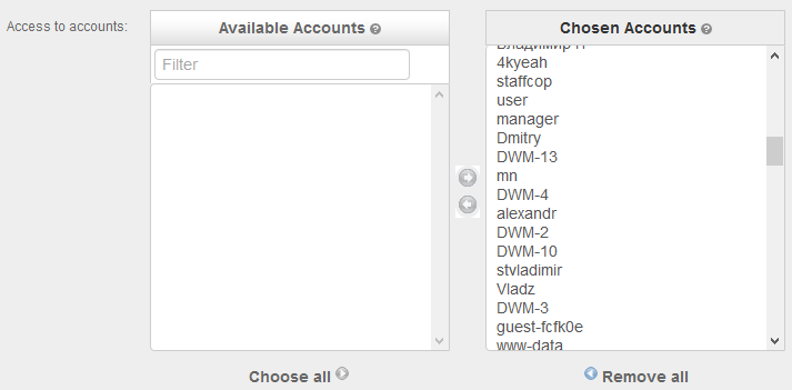 Using the navigation buttons you can assign configuration to agents. For example, click the Choose all in Available agent button to transfer them to the column Chosen agents. Double-click on an angent to move it to the list.